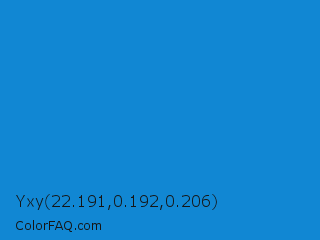 Yxy 22.191,0.192,0.206 Color is a normal blue color and the nearest color is Rich Electric Blue #0892d0. Hex code #1187d3 and RGB value is rgb(17,135,211). In RGB color space, this color is composed of 7% red, 53% green, 83% blue, In CMYK color space, this color is composed of 92% cyan, 36% magenta, 0% yellow , 17% black , In HSL color space, this color has a hue angle of 204° , 85% saturation and 45% lightness.