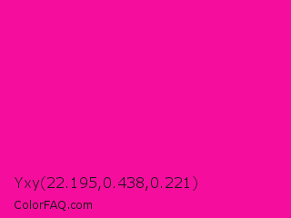 Yxy 22.195,0.438,0.221 Color is a normal magenta color and the nearest color is Hollywood Cerise #f400a1. Hex code #f50e9e and RGB value is rgb(245,14,158). In RGB color space, this color is composed of 96% red, 5% green, 62% blue, In CMYK color space, this color is composed of 0% cyan, 94% magenta, 36% yellow , 4% black , In HSL color space, this color has a hue angle of 323° , 92% saturation and 51% lightness.