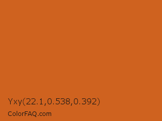 Yxy 22.1,0.538,0.392 Color is a normal orange color and the nearest color is Piper #c96323. Hex code #cf621f and RGB value is rgb(207,98,31). In RGB color space, this color is composed of 81% red, 38% green, 12% blue, In CMYK color space, this color is composed of 0% cyan, 53% magenta, 85% yellow , 19% black , In HSL color space, this color has a hue angle of 23° , 74% saturation and 47% lightness.