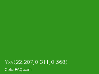 Yxy 22.207,0.311,0.568 Color is a normal green color and the nearest color is Slimy Green #299617. Hex code #30951c and RGB value is rgb(48,149,28). In RGB color space, this color is composed of 19% red, 58% green, 11% blue, In CMYK color space, this color is composed of 68% cyan, 0% magenta, 81% yellow , 42% black , In HSL color space, this color has a hue angle of 110° , 68% saturation and 35% lightness.