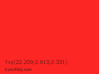 Yxy 22.209,0.613,0.331 Color is a normal red color and the nearest color is Red Pigment #ed1c24. Hex code #fc2624 and RGB value is rgb(252,38,36). In RGB color space, this color is composed of 99% red, 15% green, 14% blue, In CMYK color space, this color is composed of 0% cyan, 85% magenta, 86% yellow , 1% black , In HSL color space, this color has a hue angle of 1° , 97% saturation and 56% lightness.