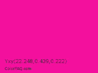 Yxy 22.248,0.439,0.222 Color is a normal magenta color and the nearest color is Fluorescent Pink #ff1493. Hex code #f5109d and RGB value is rgb(245,16,157). In RGB color space, this color is composed of 96% red, 6% green, 62% blue, In CMYK color space, this color is composed of 0% cyan, 93% magenta, 36% yellow , 4% black , In HSL color space, this color has a hue angle of 323° , 92% saturation and 51% lightness.