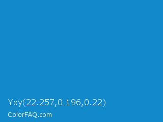 Yxy 22.257,0.196,0.22 Color is a normal blue color and the nearest color is Cyan Cornflower Blue #188bc2. Hex code #1289ca and RGB value is rgb(18,137,202). In RGB color space, this color is composed of 7% red, 54% green, 79% blue, In CMYK color space, this color is composed of 91% cyan, 32% magenta, 0% yellow , 21% black , In HSL color space, this color has a hue angle of 201° , 84% saturation and 43% lightness.