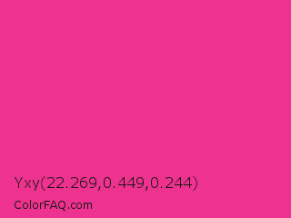 Yxy 22.269,0.449,0.244 Color is a normal rose color and the nearest color is Cerise Pink #ec3b83. Hex code #ed328f and RGB value is rgb(237,50,143). In RGB color space, this color is composed of 93% red, 20% green, 56% blue, In CMYK color space, this color is composed of 0% cyan, 79% magenta, 40% yellow , 7% black , In HSL color space, this color has a hue angle of 330° , 84% saturation and 56% lightness.