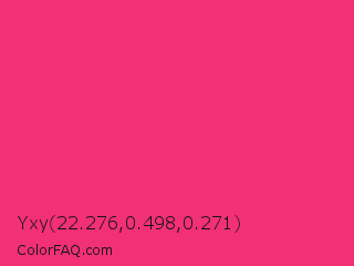 Yxy 22.276,0.498,0.271 Color is a normal rose color and the nearest color is Cerise Pink #ec3b83. Hex code #f23075 and RGB value is rgb(242,48,117). In RGB color space, this color is composed of 95% red, 19% green, 46% blue, In CMYK color space, this color is composed of 0% cyan, 80% magenta, 52% yellow , 5% black , In HSL color space, this color has a hue angle of 339° , 88% saturation and 57% lightness.