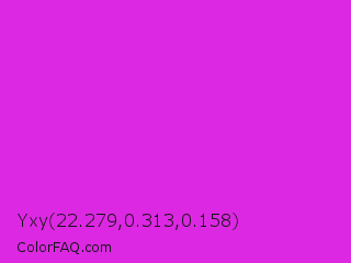 Yxy 22.279,0.313,0.158 Color is a normal magenta color and the nearest color is Steel Pink #cc33cc. Hex code #dc28e3 and RGB value is rgb(220,40,227). In RGB color space, this color is composed of 86% red, 16% green, 89% blue, In CMYK color space, this color is composed of 3% cyan, 82% magenta, 0% yellow , 11% black , In HSL color space, this color has a hue angle of 298° , 77% saturation and 52% lightness.