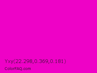 Yxy 22.298,0.369,0.181 Color is a normal magenta color and the nearest color is Purple Pizzazz #ff00cc. Hex code #ee02c6 and RGB value is rgb(238,2,198). In RGB color space, this color is composed of 93% red, 1% green, 78% blue, In CMYK color space, this color is composed of 0% cyan, 99% magenta, 17% yellow , 7% black , In HSL color space, this color has a hue angle of 310° , 98% saturation and 47% lightness.