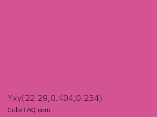 Yxy 22.29,0.404,0.254 Color is a normal rose color and the nearest color is Pink Pantone #d74894. Hex code #d45393 and RGB value is rgb(212,83,147). In RGB color space, this color is composed of 83% red, 33% green, 58% blue, In CMYK color space, this color is composed of 0% cyan, 61% magenta, 31% yellow , 17% black , In HSL color space, this color has a hue angle of 330° , 60% saturation and 58% lightness.