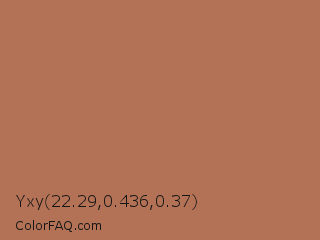 Yxy 22.29,0.436,0.37 Color is a normal orange color and the nearest color is Santa Fe #b16d52. Hex code #b37256 and RGB value is rgb(179,114,86). In RGB color space, this color is composed of 70% red, 45% green, 34% blue, In CMYK color space, this color is composed of 0% cyan, 36% magenta, 52% yellow , 30% black , In HSL color space, this color has a hue angle of 18° , 38% saturation and 52% lightness.