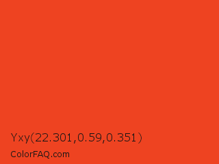 Yxy 22.301,0.59,0.351 Color is a normal red color and the nearest color is Pomegranate #f34723. Hex code #ee4321 and RGB value is rgb(238,67,33). In RGB color space, this color is composed of 93% red, 26% green, 13% blue, In CMYK color space, this color is composed of 0% cyan, 72% magenta, 86% yellow , 7% black , In HSL color space, this color has a hue angle of 10° , 86% saturation and 53% lightness.