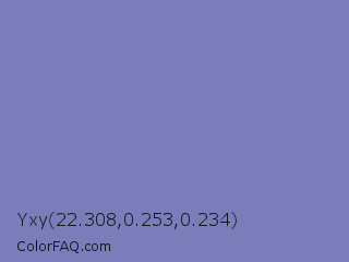 Yxy 22.308,0.253,0.234 Color is a normal blue color and the nearest color is Wild Blue Yonder #7a89b8. Hex code #7a7db9 and RGB value is rgb(122,125,185). In RGB color space, this color is composed of 48% red, 49% green, 73% blue, In CMYK color space, this color is composed of 34% cyan, 32% magenta, 0% yellow , 27% black , In HSL color space, this color has a hue angle of 237° , 31% saturation and 60% lightness.
