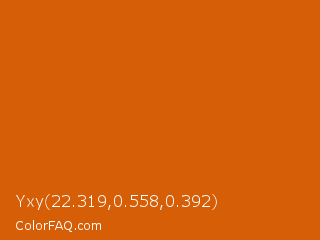 Yxy 22.319,0.558,0.392 Color is a normal orange color and the nearest color is Red Stage #d05f04. Hex code #d65e07 and RGB value is rgb(214,94,7). In RGB color space, this color is composed of 84% red, 37% green, 3% blue, In CMYK color space, this color is composed of 0% cyan, 56% magenta, 97% yellow , 16% black , In HSL color space, this color has a hue angle of 25° , 94% saturation and 43% lightness.