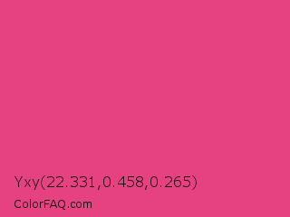 Yxy 22.331,0.458,0.265 Color is a normal rose color and the nearest color is Cerise Pink #ec3b83. Hex code #e64282 and RGB value is rgb(230,66,130). In RGB color space, this color is composed of 90% red, 26% green, 51% blue, In CMYK color space, this color is composed of 0% cyan, 71% magenta, 43% yellow , 10% black , In HSL color space, this color has a hue angle of 337° , 77% saturation and 58% lightness.