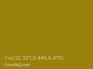 Yxy 22.337,0.449,0.475 Color is a normal yellow color and the nearest color is Dark Yellow #9b870c. Hex code #9a800d and RGB value is rgb(154,128,13). In RGB color space, this color is composed of 60% red, 50% green, 5% blue, In CMYK color space, this color is composed of 0% cyan, 17% magenta, 92% yellow , 40% black , In HSL color space, this color has a hue angle of 49° , 84% saturation and 33% lightness.