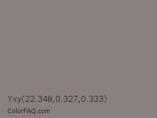 Yxy 22.348,0.327,0.333 Color is a normal red color and the nearest color is Rocket Metallic #8a7f80. Hex code #8a807e and RGB value is rgb(138,128,126). In RGB color space, this color is composed of 54% red, 50% green, 49% blue, In CMYK color space, this color is composed of 0% cyan, 7% magenta, 9% yellow , 46% black , In HSL color space, this color has a hue angle of 10° , 5% saturation and 52% lightness.