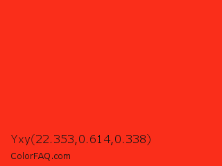 Yxy 22.353,0.614,0.338 Color is a normal red color and the nearest color is Red RYB #fe2712. Hex code #fa2e1a and RGB value is rgb(250,46,26). In RGB color space, this color is composed of 98% red, 18% green, 10% blue, In CMYK color space, this color is composed of 0% cyan, 82% magenta, 90% yellow , 2% black , In HSL color space, this color has a hue angle of 5° , 96% saturation and 54% lightness.
