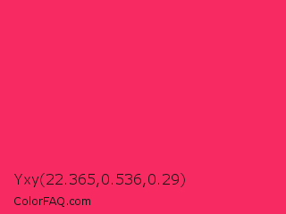 Yxy 22.365,0.536,0.29 Color is a normal rose color and the nearest color is Radical Red #ff355e. Hex code #f72b61 and RGB value is rgb(247,43,97). In RGB color space, this color is composed of 97% red, 17% green, 38% blue, In CMYK color space, this color is composed of 0% cyan, 83% magenta, 61% yellow , 3% black , In HSL color space, this color has a hue angle of 344° , 93% saturation and 57% lightness.