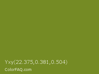 Yxy 22.375,0.381,0.504 Color is a normal lime color and the nearest color is Wasabi #788a25. Hex code #758b24 and RGB value is rgb(117,139,36). In RGB color space, this color is composed of 46% red, 55% green, 14% blue, In CMYK color space, this color is composed of 16% cyan, 0% magenta, 74% yellow , 45% black , In HSL color space, this color has a hue angle of 73° , 59% saturation and 34% lightness.