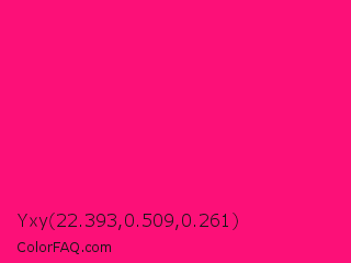 Yxy 22.393,0.509,0.261 Color is a normal rose color and the nearest color is Winter Sky #ff007c. Hex code #fc1078 and RGB value is rgb(252,16,120). In RGB color space, this color is composed of 99% red, 6% green, 47% blue, In CMYK color space, this color is composed of 0% cyan, 94% magenta, 52% yellow , 1% black , In HSL color space, this color has a hue angle of 334° , 98% saturation and 53% lightness.