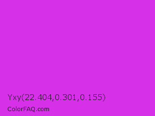 Yxy 22.404,0.301,0.155 Color is a normal magenta color and the nearest color is Steel Pink #cc33cc. Hex code #d631e8 and RGB value is rgb(214,49,232). In RGB color space, this color is composed of 84% red, 19% green, 91% blue, In CMYK color space, this color is composed of 8% cyan, 79% magenta, 0% yellow , 9% black , In HSL color space, this color has a hue angle of 294° , 80% saturation and 55% lightness.