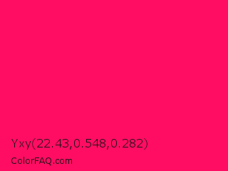 Yxy 22.43,0.548,0.282 Color is a normal rose color and the nearest color is Vivid Raspberry #ff006c. Hex code #ff0d62 and RGB value is rgb(255,13,98). In RGB color space, this color is composed of 100% red, 5% green, 38% blue, In CMYK color space, this color is composed of 0% cyan, 95% magenta, 62% yellow , 0% black , In HSL color space, this color has a hue angle of 339° , 100% saturation and 53% lightness.