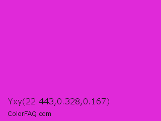 Yxy 22.443,0.328,0.167 Color is a normal magenta color and the nearest color is Steel Pink #cc33cc. Hex code #e029d9 and RGB value is rgb(224,41,217). In RGB color space, this color is composed of 88% red, 16% green, 85% blue, In CMYK color space, this color is composed of 0% cyan, 82% magenta, 3% yellow , 12% black , In HSL color space, this color has a hue angle of 302° , 75% saturation and 52% lightness.