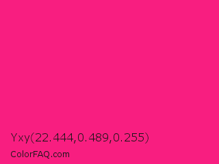 Yxy 22.444,0.489,0.255 Color is a normal rose color and the nearest color is Fluorescent Pink #ff1493. Hex code #f81e80 and RGB value is rgb(248,30,128). In RGB color space, this color is composed of 97% red, 12% green, 50% blue, In CMYK color space, this color is composed of 0% cyan, 88% magenta, 48% yellow , 3% black , In HSL color space, this color has a hue angle of 333° , 94% saturation and 55% lightness.