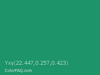 Yxy 22.447,0.257,0.423 Color is a normal green color and the nearest color is Eucalyptus #278a5b. Hex code #1d9469 and RGB value is rgb(29,148,105). In RGB color space, this color is composed of 11% red, 58% green, 41% blue, In CMYK color space, this color is composed of 80% cyan, 0% magenta, 29% yellow , 42% black , In HSL color space, this color has a hue angle of 158° , 67% saturation and 35% lightness.