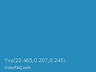 Yxy 22.465,0.207,0.245 Color is a normal blue color and the nearest color is Cyan Cornflower Blue #188bc2. Hex code #268bbb and RGB value is rgb(38,139,187). In RGB color space, this color is composed of 15% red, 55% green, 73% blue, In CMYK color space, this color is composed of 80% cyan, 26% magenta, 0% yellow , 27% black , In HSL color space, this color has a hue angle of 199° , 66% saturation and 44% lightness.