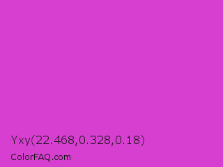 Yxy 22.468,0.328,0.18 Color is a normal magenta color and the nearest color is Steel Pink #cc33cc. Hex code #d63fcf and RGB value is rgb(214,63,207). In RGB color space, this color is composed of 84% red, 25% green, 81% blue, In CMYK color space, this color is composed of 0% cyan, 71% magenta, 3% yellow , 16% black , In HSL color space, this color has a hue angle of 303° , 65% saturation and 54% lightness.