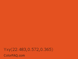 Yxy 22.483,0.572,0.365 Color is a normal color and the nearest color is Flame #e25822. Hex code #e45120 and RGB value is rgb(228,81,32). In RGB color space, this color is composed of 89% red, 32% green, 13% blue, In CMYK color space, this color is composed of 0% cyan, 64% magenta, 86% yellow , 11% black , In HSL color space, this color has a hue angle of 15° , 78% saturation and 51% lightness.