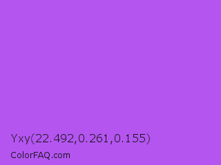 Yxy 22.492,0.261,0.155 Color is a light purple color and the nearest color is Medium Orchid #ba55d3. Hex code #b455f0 and RGB value is rgb(180,85,240). In RGB color space, this color is composed of 71% red, 33% green, 94% blue, In CMYK color space, this color is composed of 25% cyan, 65% magenta, 0% yellow , 6% black , In HSL color space, this color has a hue angle of 277° , 84% saturation and 64% lightness.