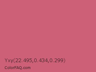 Yxy 22.495,0.434,0.299 Color is a normal red color and the nearest color is Cinnamon Satin #cd607e. Hex code #cd5f77 and RGB value is rgb(205,95,119). In RGB color space, this color is composed of 80% red, 37% green, 47% blue, In CMYK color space, this color is composed of 0% cyan, 54% magenta, 42% yellow , 20% black , In HSL color space, this color has a hue angle of 347° , 52% saturation and 59% lightness.