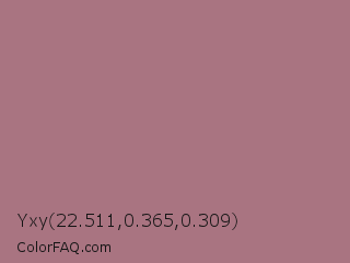 Yxy 22.511,0.365,0.309 Color is a normal red color and the nearest color is Turkish Rose #b57281. Hex code #a97481 and RGB value is rgb(169,116,129). In RGB color space, this color is composed of 66% red, 45% green, 51% blue, In CMYK color space, this color is composed of 0% cyan, 31% magenta, 24% yellow , 34% black , In HSL color space, this color has a hue angle of 345° , 24% saturation and 56% lightness.
