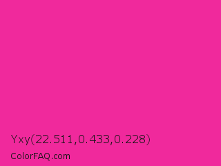 Yxy 22.511,0.433,0.228 Color is a normal magenta color and the nearest color is Persian Rose #fe28a2. Hex code #f0299c and RGB value is rgb(240,41,156). In RGB color space, this color is composed of 94% red, 16% green, 61% blue, In CMYK color space, this color is composed of 0% cyan, 83% magenta, 35% yellow , 6% black , In HSL color space, this color has a hue angle of 325° , 87% saturation and 55% lightness.