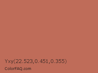 Yxy 22.523,0.451,0.355 Color is a normal red color and the nearest color is Copper Red #cb6d51. Hex code #bf6c59 and RGB value is rgb(191,108,89). In RGB color space, this color is composed of 75% red, 42% green, 35% blue, In CMYK color space, this color is composed of 0% cyan, 43% magenta, 53% yellow , 25% black , In HSL color space, this color has a hue angle of 11° , 44% saturation and 55% lightness.