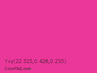 Yxy 22.525,0.428,0.235 Color is a normal magenta color and the nearest color is Frostbite #e936a7. Hex code #ea3799 and RGB value is rgb(234,55,153). In RGB color space, this color is composed of 92% red, 22% green, 60% blue, In CMYK color space, this color is composed of 0% cyan, 76% magenta, 35% yellow , 8% black , In HSL color space, this color has a hue angle of 327° , 81% saturation and 57% lightness.