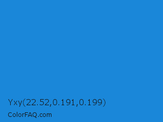 Yxy 22.52,0.191,0.199 Color is a normal blue color and the nearest color is Curious Blue #2596d1. Hex code #1a87d9 and RGB value is rgb(26,135,217). In RGB color space, this color is composed of 10% red, 53% green, 85% blue, In CMYK color space, this color is composed of 88% cyan, 38% magenta, 0% yellow , 15% black , In HSL color space, this color has a hue angle of 206° , 79% saturation and 48% lightness.