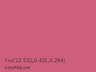 Yxy 22.532,0.431,0.294 Color is a normal red color and the nearest color is Cinnamon Satin #cd607e. Hex code #ce5e7a and RGB value is rgb(206,94,122). In RGB color space, this color is composed of 81% red, 37% green, 48% blue, In CMYK color space, this color is composed of 0% cyan, 54% magenta, 41% yellow , 19% black , In HSL color space, this color has a hue angle of 345° , 53% saturation and 59% lightness.