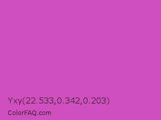 Yxy 22.533,0.342,0.203 Color is a normal magenta color and the nearest color is Fuchsia Pink #c154c1. Hex code #d04ebd and RGB value is rgb(208,78,189). In RGB color space, this color is composed of 82% red, 31% green, 74% blue, In CMYK color space, this color is composed of 0% cyan, 63% magenta, 9% yellow , 18% black , In HSL color space, this color has a hue angle of 309° , 58% saturation and 56% lightness.