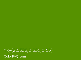 Yxy 22.536,0.351,0.56 Color is a dark green color and the nearest color is Avocado #568203. Hex code #569200 and RGB value is rgb(86,146,0). In RGB color space, this color is composed of 34% red, 57% green, 0% blue, In CMYK color space, this color is composed of 41% cyan, 0% magenta, 100% yellow , 43% black , In HSL color space, this color has a hue angle of 85° , 100% saturation and 29% lightness.