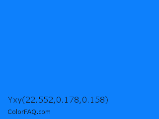 Yxy 22.552,0.178,0.158 Color is a normal blue color and the nearest color is Azure Radiance #007fff. Hex code #0d80fc and RGB value is rgb(13,128,252). In RGB color space, this color is composed of 5% red, 50% green, 99% blue, In CMYK color space, this color is composed of 95% cyan, 49% magenta, 0% yellow , 1% black , In HSL color space, this color has a hue angle of 211° , 98% saturation and 52% lightness.