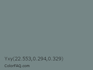 Yxy 22.553,0.294,0.329 Color is a normal cyan color and the nearest color is Blue Smoke #748881. Hex code #758686 and RGB value is rgb(117,134,134). In RGB color space, this color is composed of 46% red, 53% green, 53% blue, In CMYK color space, this color is composed of 13% cyan, 0% magenta, 0% yellow , 47% black , In HSL color space, this color has a hue angle of 180° , 7% saturation and 49% lightness.