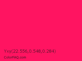 Yxy 22.556,0.548,0.284 Color is a normal rose color and the nearest color is Awesome #ff2052. Hex code #ff1461 and RGB value is rgb(255,20,97). In RGB color space, this color is composed of 100% red, 8% green, 38% blue, In CMYK color space, this color is composed of 0% cyan, 92% magenta, 62% yellow , 0% black , In HSL color space, this color has a hue angle of 340° , 100% saturation and 54% lightness.