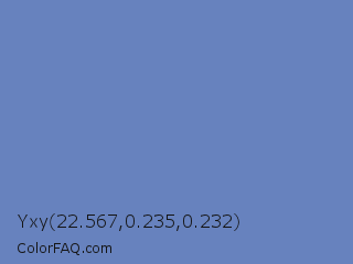 Yxy 22.567,0.235,0.232 Color is a normal blue color and the nearest color is Glaucous #6082b6. Hex code #6782be and RGB value is rgb(103,130,190). In RGB color space, this color is composed of 40% red, 51% green, 75% blue, In CMYK color space, this color is composed of 46% cyan, 32% magenta, 0% yellow , 25% black , In HSL color space, this color has a hue angle of 221° , 40% saturation and 57% lightness.