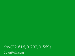 Yxy 22.616,0.292,0.569 Color is a dark green color and the nearest color is North Texas Green #059033. Hex code #039825 and RGB value is rgb(3,152,37). In RGB color space, this color is composed of 1% red, 60% green, 15% blue, In CMYK color space, this color is composed of 98% cyan, 0% magenta, 76% yellow , 40% black , In HSL color space, this color has a hue angle of 134° , 96% saturation and 30% lightness.