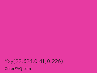 Yxy 22.624,0.41,0.226 Color is a normal magenta color and the nearest color is Frostbite #e936a7. Hex code #e73aa2 and RGB value is rgb(231,58,162). In RGB color space, this color is composed of 91% red, 23% green, 64% blue, In CMYK color space, this color is composed of 0% cyan, 75% magenta, 30% yellow , 9% black , In HSL color space, this color has a hue angle of 324° , 78% saturation and 57% lightness.