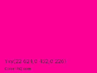 Yxy 22.624,0.452,0.226 Color is a normal magenta color and the nearest color is Hollywood Cerise #f400a1. Hex code #fa0099 and RGB value is rgb(250,0,153). In RGB color space, this color is composed of 98% red, 0% green, 60% blue, In CMYK color space, this color is composed of 0% cyan, 100% magenta, 39% yellow , 2% black , In HSL color space, this color has a hue angle of 323° , 100% saturation and 49% lightness.