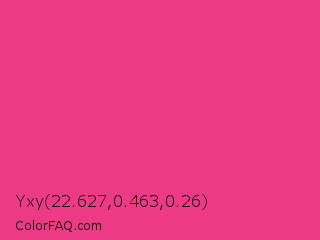 Yxy 22.627,0.463,0.26 Color is a normal rose color and the nearest color is Cerise Pink #ec3b83. Hex code #ec3b84 and RGB value is rgb(236,59,132). In RGB color space, this color is composed of 93% red, 23% green, 52% blue, In CMYK color space, this color is composed of 0% cyan, 75% magenta, 44% yellow , 7% black , In HSL color space, this color has a hue angle of 335° , 82% saturation and 58% lightness.