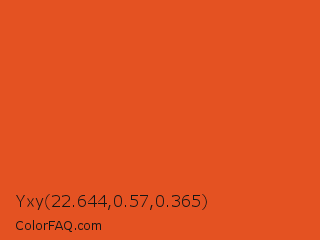 Yxy 22.644,0.57,0.365 Color is a normal color and the nearest color is Flame #e25822. Hex code #e45222 and RGB value is rgb(228,82,34). In RGB color space, this color is composed of 89% red, 32% green, 13% blue, In CMYK color space, this color is composed of 0% cyan, 64% magenta, 85% yellow , 11% black , In HSL color space, this color has a hue angle of 15° , 78% saturation and 51% lightness.
